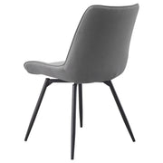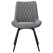 Effortlessly stylish and functional, this swivel dining chair blends retro-inspired charm with modern comfort. Wrapped in plush leatherette upholstery, the diamond-quilted interior adds rich texture and an elevated touch. A padded bucket seat with a tall backrest ensures lasting support, while the 360-degree swivel mechanism allows easy movement. Resting on tapered, flared legs in a sleek gunmetal finish, this chair is perfect for dining spaces, kitchen nooks, or casual lounge areas, bringing a playful yet sophisticated flair to any setting. Key Features: • Swivel dining chair with a padded bucket seat for comfort and ergonomic support • Soft leatherette upholstery with diamond-quilted interior adds a stylish texture • Tapered and flared metal legs in a gunmetal finish enhance retro appeal • Smooth 360-degree swivel base provides effortless movement and convenience • Tall backrest offers long-lasting support for extended dining or lounging • Versatile design is ideal for dining spaces, kitchen nooks, or casual seating areas