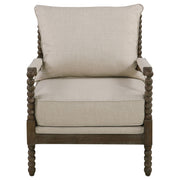 Light and bright as can be, this contemporary accent chair offers a cheerful look to any space. This accent chair offers comfortable seating with each cushion wrapped in a white linen-like upholstery accented with navy awning stripes. With a sharply designed frame that includes decorative spindle back posts, legs and armrests, all in bright white finish, this accent chair lends a subtle boho style. In addition, this accent chair offers extra details such as padded armrests and welt trim. Place this nautical-inspired accent chair on a covered veranda or a sunroom for a crisp, clean look. Key Features: • Brighten your décor with a matched awning stripe accent chair • Stylishly framed with white decorative spindle back posts, legs and armrests • Sinuous spring and pocket coil seat construction for lasting comfort • Reversible back cushion for added support • Constructed with solid hardwood, rubberwood, and fabric