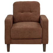 This modern accent chair brings cozy scale and crisp structure to any compact space. Wrapped in soft, textured upholstery, it features slim track arms with cord welt trim and a grid-tufted back for tailored charm. A pocket coil seat offers long-lasting comfort, while tapered round legs provide a stable, elevated base. Perfectly sized for apartments, bedrooms, or reading nooks, this chair delivers a refined yet inviting presence. Key Features: • Accent chair with slim track arms and tailored grid-tufted back cushion for refined comfort • Rust upholstery adds soft texture and a modern neutral tone for any small space • Cord welt trim outlines the frame and seat with crisp, polished detail • Pocket coil seat construction offers firm support and enduring comfort • Soft polyester fabric is smooth to the touch and easy to care for in daily use • Tapered round legs deliver lifted stability and a sleek, mid-century inspired look