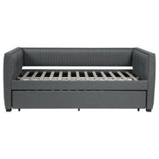 A gray fabric, pleated and overlapping along the surface of this twin daybed and trundle set, create a textured appearance against the clean straight lines. The narrow arms and backrest invite you to get creative with your own accent pillows and throws, opening this furniture piece up to becoming a lounge sofa or a bed for additional overnight guests. A trundle slips beneath the main frame when not in use or can be retrieved and glided out effortlessly. Black finish feet add slight elevation and a pop of contrast against flooring and rugs too. This twin daybed trundle set is the perfect addition for compact, multipurpose spaces like home offices and guestrooms. Key Features: • With its thin, pleated, fabric details, this shelter back daybed features exceptional tailoring throughout • Relax in comfort with this sleeping, lounging, daybed must-have • Perfect for smaller living areas, convenient pull out trundle for extra sleeping space when needed • Upholstered in grey fabric • Frame constructed with pine and MDF • Slat kits included