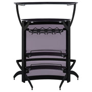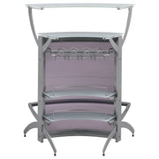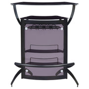 Presenting plenty of contemporary vibes, this home bar is sleek in every aspect. The black finish and acrylic construction give this piece an upscale look and feel. A rounded design offers storage space on multiple shelving units. Also included on this contemporary bar table are stemware racks to hold plenty of wine glasses. Whether you are entertaining a party of two or many, this contemporary bar table is the right choice for a stylish home. Key Features: • Contemporary bar unit showcases a curved chic design with metal frame in a silver finish • Smoked acrylic panels provide a high-end feel • Two-tier frosted tempered glass tops with two (2) frosted tempered glass shelves • Features stemware rack and three (3) bottle wine rack • Features 3 units, creating the ultimate bar setup