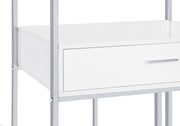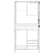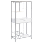 A modular design with integrated LED lighting offers a fresh, modern look, perfect for hosting guests in your contemporary setting. This wine cabinet features a minimalist and linear design with four open shelves, a convenient pull-out drawer, two tiers of wine bottle storage, and integrated stemware racks. Constructed from engineered wood in a white high-gloss, scratch-resistant finish, it is complemented by a sleek silver-finished rectangular frame. Combining style and functionality, it’s an ideal choice for serving and entertaining. Key Features: • Modular wine cabinet with LED lighting and four open shelves • Engineered wood in a white high-gloss, scratch-resistant finish • Sleek chrome finished rectangular frame for a modern aesthetic_x005F_x000D_ • Single pull-out drawer for added storage convenience • Two tiers of wine bottle storage for efficient organization • Integrated stemware racks keep glassware easily accessible