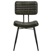 Blending industrial edge with vintage charm, this dining side chair is a striking addition to any dining space. Upholstered in hand-dyed genuine goat leather, the padded seat and backrest offer both comfort and durability. Vertical tufting details enhance texture and create a refined look, while the flared and tapered metal legs in a deep black finish provide sturdy support with a sleek contrast. Designed for long-lasting appeal, this chair brings a sophisticated yet rugged aesthetic to modern, industrial, or rustic interiors. Key Features: • Dining side chair with hand-dyed antique camel genuine goat leather upholstery • Padded seat and backrest provide comfort with a supportive, contoured feel • Vertical tufting details enhance texture and vintage-inspired charm • Flared and tapered metal legs in a deep black finish offer sturdy support • Strong metal frame ensures lasting durability for everyday dining use • A stylish addition to industrial, rustic, and modern dining spaces