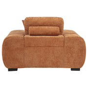Transform your reading nook or living area into a haven of comfort with this mid-century inspired chair. Its wide, rounded arms and plush, tufted waterfall seat invite you to relax, while soft, neutral upholstery enhances its cozy appeal. A durable frame ensures long-lasting support, and reversible back cushion offer adjustable comfort. This versatile chair captures a refined yet inviting look, seamlessly blending style with everyday usability. Key Features: • Accent chair in camel fabric features sculptural curves and deep vertical channel tufting • Wide seat with plush waterfall cushioning offers bold form and full-body comfort • Reversible back cushion and accent pillow provide flexibility and cozy support • Fully upholstered from base to back for a soft, cohesive visual appearance • Padded with layered foam over a durable wood frame for lasting everyday use • Perfect as a statement seat in living rooms, bedrooms, or modern lounge spaces