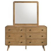 Achieve the perfect blend of style and functionality with this mid-century modern dresser and mirror set. The dresser, constructed with pine, engineered wood, and walnut veneer, features six spacious drawers with felt-lined top drawers for organizing wardrobe essentials. Rounded edges, tapered legs, and a clean silhouette highlight the retro-modern appeal of this timeless duo. The matching mirror completes the set with its sophisticated design and polished details. Key Features: • Dark walnut dresser and mirror set with a cohesive aesthetic • Six spacious drawers with felt-lined tops protect delicate items • Rounded edges and tapered legs add retro-modern appeal • Mirror features a rich walnut veneer frame with soft wood grain detailing • Constructed from pine, engineered wood, and walnut veneer for durability • Timeless design blends function with mid-century elegance