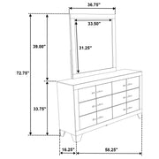 The dresser and mirror set combines sleek, contemporary lines with a touch of rustic charm, making it a standout addition to any bedroom. The dresser, finished in a rustic cream over rough-sawn, white-washed engineered paper veneer, offers six spacious drawers adorned with extra-wide polished nickel handles, adding a modern contrast. The mirror, with a clean-lined frame that complements the dresser, reflects light beautifully to enhance the room's brightness. Built from durable engineered wood with English dovetail joinery and Center metal glides, this set delivers both style and functionality. Key Features: • Dresser in rustic cream with rough-sawn, white-washed engineered paper veneer • Six spacious drawers with English dovetail joinery for added durability • Extra-wide polished nickel handles for a sleek, modern look • Mirror adds depth and light, enhancing the room’s visual appeal • Smooth Center metal drawer glides for easy access • Perfect combination of rustic charm and contemporary design