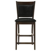 This counter height chair brings casual elegance and lasting comfort to any dining space. Crafted from solid rubberwood in a rich espresso finish, it features a sleek silhouette and supportive full back for modern appeal. The padded seat and back are upholstered in smooth black leatherette, providing easy maintenance and a touch of sophistication. A sturdy footrest adds support while dining or entertaining, making this chair a stylish and practical addition to your counter height table or kitchen island. Key Features: • Counter height chair in espresso finish adds casual sophistication to modern dining rooms • Black leatherette upholstery on seat and back provides smooth, easy-to-clean comfort • Full back design offers supportive seating ideal for extended dining or gatherings • Cushioned padding ensures lasting comfort and a tailored, refined appearance • Crossbar footrest enhances stability and offers a convenient resting place • Crafted from solid rubberwood and faux leather for durable everyday use