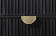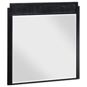 A rich black finish create a sophisticated palette for a four-piece modern bedroom set. Complete with wire brushing that creates texture, the set features fluted details that add elegance and character. The bed features an open silhouette with a low footboard, while a tall headboard centers your space. A two-drawer nightstand includes a felt lined top drawer to protect delicates like your watch or phone, leaving plenty of space in the bottom drawer for books and other essentials. The dresser and mirror set completes the look, offering plenty of storage in eight drawers, including felt lining in the top two, for clothing and accessories. Key Features: • Stylish and modern, a contemporary wood bedroom set features a wire brushed black finish • Square headboard and footboard create a complementary pairing and open silhouette • Fluted texturing highlights the bed, nightstand, dresser and mirror • Drawers feature demi-lune metal handles in a warm golden tone for sophisticated contrast • Bed includes slats with support legs to provide an excellent base for your mattress set • Drawers feature English dovetail joinery for excellent craftsmanship