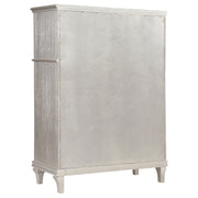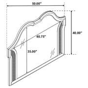 Complete your primary suite with this stunning, glam bedroom set, featuring a lovely platform bed, nightstand, dresser, and mirror combo in a gorgeous silver oak finish with glittering accent panels. The platform bed boasts a beautiful double arch headboard and matching footboard, designed with a channel tufted, foam padded insert upholstered in a soft, ivory fabric that invites you to lean back and relax. Soft, grey, felt-lined top drawers in the dresser and nightstand keep delicates protected, while the nightstand offers a built-in USB port to keep handheld devices charged as you prepare for the day. Slender hexagon-shaped hardware with pearlescent accents adorns each of the curved drawer fronts, allowing you to grab items easily. A double arch framed mirror with a timeless beveled edge offers a contemporary flair and sleek attention to detail. Key Features: • Double arch head and footboards feature lush ivory fabric upholstery with foam padding • Silver oak finish with glimmering accent panels is elegant and modern, delivering a glam finishing touch • Framed beveled mirror creates an instant dressing vanity setup • Hexagonal shaped hardware with pearl-like center accents offer a modern flair • Soft grey felt lining on the top dresser drawers offer space for delicates