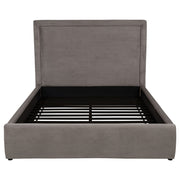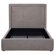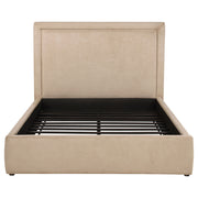 Clean lines and understated elegance define this platform bed, wrapped in smooth upholstery from base to headboard. The simple panel design offers a tailored profile, softened by subtle padding and low foot rails for an inviting finish. With a fully slatted foundation, this bed supports a mattress directly, no box spring needed. Perfect for modern minimalists or transitional spaces, it balances comfort and clarity in a sleek, grounded silhouette. Key Features: • Queen bed with clean panel headboard and fully upholstered low-profile frame • Light saddle fabric adds warm tone and soft texture with a neutral foundation • Padded headboard delivers comfort and structure in an understated silhouette • Platform base with slats eliminates need for a box spring or foundation • Crafted with engineered wood, and supportive foam fill • Perfect for transitional or modern bedrooms with a minimalist focus