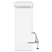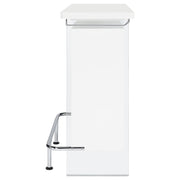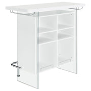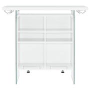 Elevate a multipurpose living room with this modern bar unit. A neutral finish, accented with polished chrome metal accents offers a striking design contrast. Supported and flanked by clear tempered glass side panels, this bar unit boasts ultra-modern elements as well for a dramatic feel. Compact yet highly functional, this bar unit also features ample storage space with six built-in open shelves for storing bottles, serving pieces and other mixologist must-haves. Tucked beneath the bar top along each side is a stemware rack for wine glasses and more. Key Features: • Modern front bar unit finished in white high gloss • Thick clear tempered glass side panels with steel footrest electroplated in chrome • Features six storage shelves and stemware racks • Constructed with MDF, particle board, glass, and metal