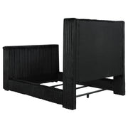 Unveil a new chapter of indulgence with this velvet wingback bed, where high style meets high tech. Richly upholstered in decadent black velvet, its vertical channeled frame embraces you in plush softness. Hidden within the footboard, a concealed TV lift fits up to 50-inch TVs and rises with the push of a button. A built-in power outlet with three AC ports adds plug-and-play convenience. This bed transforms any room into a sanctuary of luxury, beauty, and cinematic escape. Key Features: • Queen bed with tall wingback frame and vertical channel tufting in black velvet • Built-in TV lift mechanism accommodates TVs up to fifty inches in size • Three-outlet AC power strip hidden in footboard for seamless device connection • Plush velvet upholstery adds glam texture to the sculptural modern silhouette • Foam-padded and fully upholstered for comfort and a clean, finished look • Crafted from birch, engineered wood, and plywood for durability and support