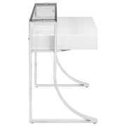 Add an edge of contemporary flair to any living space. This sleek, stylish writing desk exudes glamorous appeal. Its eye-catching frame is expertly crafted with a gracefully curved silhouette. Its gorgeous, glossy white surface blends appealingly with its shining chrome legs. Complete with two felt-lined drawers with full extension glides, this desk enhances any home office with convenience and modern style. Key Features: • Classic writing desk in high gloss white lacquer finish • Metal frame electroplated in polished chrome finish • Hutch includes clear tempered glass for strength • Desk features two (2) drawers with full extension glides • Metal, glass, and MDF construction