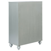 This contemporary 4-piece bedroom set featuring a bed, nightstand, dresser, and mirror imparts a glamorous look and feel to any modern home. Each piece of this exclusive Coaster design comes in a shimmering silver metallic finish that enlivens any space. The imposing bed headboard is upholstered with metallic leatherette that's fully tufted with crystal buttons. The headboard and mirror include white LED touch lighting for a vibrant ambiance, while the nightstand features USB ports. The drawers on each case good are crafted with fret work detail on the front panels and crystal-like pulls, with top drawers lined with black felt to protect your valuables. Key Features: • Bedroom set includes matching platform bed and mirrored storage pieces • Silver metallic finish pairs with mirrored trim and crystal hardware throughout • Headboard features LED lighting and tufted metallic leatherette upholstery • Drawer fronts include raised fretwork with felt-lined top drawers • Nightstand includes built-in USB ports for charging convenience • Engineered wood and polyresin construction offers style and lasting durability