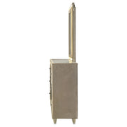 Warmth meets radiance in this dresser and mirror set, where ivory and camel velvet surround every surface. A built-in flame visualizer sits beneath a clear tempered glass top, with LED case lighting adding atmosphere. The tri-panel mirror features LED illumination to complete the glow. Finished with crystal knobs, quilted velvet fronts, and felt-lined drawers, this set pairs soft elegance with practical brilliance, all lifted by solid rubberwood legs. Key Features: • Eight-drawer dresser and mirror set with LED-lit case and flame visualizer (no heat) with remote • Ivory and camel velvet wrap pairs with reflective acrylic for luminous texture • Mirror includes tri-panel design with built-in LED lighting for expanded view • Clear tempered glass tops the dresser for protection and shine • Felt-lined top drawers, dovetail joinery, and smooth glides for quality use • Crystal knobs and solid rubberwood legs provide both sparkle and structural support