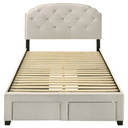 Indulge in comfort and utility with this platform storage bed, where graceful design meets everyday practicality. A tufted velvet headboard with gentle curves and nailhead trim brings refined elegance, while four built-in drawers offer generous hidden storage. Expertly crafted from rubberwood, engineered wood, and foam, this fully slatted frame eliminates the need for a foundation. It's a sophisticated solution for streamlined, serene living. Key Features: • Queen platform bed with scalloped tufted headboard for graceful tailored dimension • Cream velvet upholstery with button tufting and nickel nailhead trim for elegance • Includes four spacious drawers for concealed clothing or linen storage solutions • Fully slatted base supports mattress directly with no foundation or box spring • Built from rubberwood and engineered wood for stability, durability, and strength • Foam-filled headboard adds comfort while combining classic detail with function