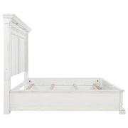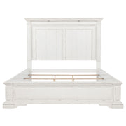 Infused with vintage elegance and practical design, this panel bed offers timeless structure with thoughtful detail. Ornate molding and recessed panels lend refined character, while a distressed white finish softens the frame with antique charm. Dual LED reading lights are subtly tucked beneath the crown—one on each side—casting focused illumination downward. Crafted from poplar and engineered wood, it brings beauty and everyday function into perfect balance. Key Features: • Queen panel bed with crown molding and carved accents for traditional charm • Vintage white finish showcases distressed texture with timeless elegance • Dual LED reading lights under crown cast focused light on each side of the bed • Recessed headboard and footboard panels add sculptural depth and structure • Requires foundation for mattress elevation and traditional support • Crafted from poplar, engineered wood, and plywood for long-lasting visual appeal