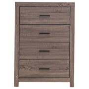 This four-drawer chest combines modern style with practical storage. Its clean-lined frame complements contemporary spaces, while four spacious drawers provide ample room for clothing, linens, and accessories. Crafted from engineered wood with a durable laminate veneer, it is built for everyday durability. Matte dark bronze handles enhance the refined look, making this chest a functional and stylish addition to any bedroom. Key Features: • Four-drawer chest with a sleek, modern silhouette and clean lines • Barrel oak finish enhances the natural wood grain-inspired aesthetic • Spacious drawers provide ample storage for clothing and essentials • Sturdy engineered wood construction ensures long-lasting durability • Matte dark bronze handles contrast beautifully with the finish • Durable laminate veneer resists scratches, stains, and everyday wear
