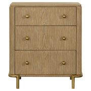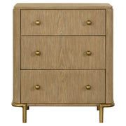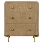Create an elegant, natural retreat with this mid-century modern bedroom set. The design features a warm sand wash finish achieved through an eleven-step wire-brushed process for subtle texture and organic tone. Woven cane panels lend an airy, handcrafted feel, framed by solid wood and metal accents in aged brass. Smooth curves and clean lines define each piece, combining refined craftsmanship with modern functionality to bring a calming, sophisticated presence to any bedroom space._x005F_x000D_ Key Features: • Bedroom set in natural organic style design accented with refined glamorous touches • Finished in an eleven-step wire brushed sand wash color for soft, rustic character • Bed crafted with solid wood, metal, and open cane panels for a fresh modern trend • Case pieces provide generous storage with aged brass finished metal base supports • Nightstand includes dual USB recharging ports for added modern functionality • Mirror features an integrated shelf designed to keep jewelry and accessories handy