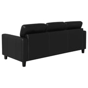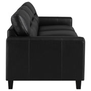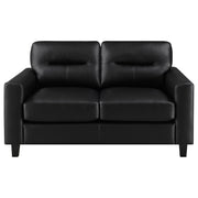 Unified by tailored silhouettes and softened edges, this seating set transforms the living room into a calm, intentional space. Smooth upholstery flows across deep cushions and wide arms, inviting rest and connection. Refined stitching and balanced lines ground each piece in quiet strength. Built for lasting comfort, this collection merges modern scale with everyday serenity and room-defining style. Key Features: • Living room seating set with bold track arms and supportive cushion structure • Black leatherette upholstery defines each piece with soft matte uniformity • Topstitched cushions offer firm comfort with a tailored, symmetrical look • Black legs unify the base and maintain a clean, streamlined presentation • Made from pine, plywood, high-density foam, and polyurethane leatherette • Designed to deliver durability and coordinated style across living spaces