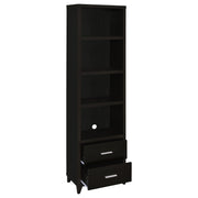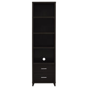 Elevate your living room with this four-piece entertainment center, finished in rich cappuccino for a sleek contemporary look. The 60-inch TV console accommodates televisions up to 60 inches and includes two framed clear tempered glass doors, adjustable shelving, and three drawers for organized storage. Flanking media towers provide additional open shelving for books and decor, along with two drawers each for concealed items. A connecting bridge tops the unit, featuring two enclosed compartments to complete the design. Brushed silver hardware and tapered legs add refined finishing touches._x005F_x000D_ Key Features: • Cappuccino 4-piece entertainment center with clean lines and brushed silver hardware • 60-inch TV stand supports televisions up to 60 inches with modern storage features • Two framed clear tempered glass doors with four adjustable shelves for media gear • Three central drawers in console provide concealed storage for games and devices • Twin media towers each feature four open shelves and two drawers for organization • Bridge includes two enclosed compartments, completing this cohesive entertainment wall