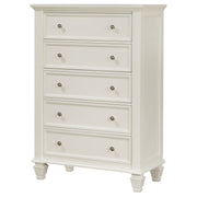 Add both storage and timeless elegance to your bedroom with this beautifully crafted chest of drawers. Featuring five spacious drawers, this chest offers plenty of room to organize your clothing, linens, and other essentials. The felt-lined top drawer provides added protection for delicate items, while the brushed nickel hardware adds a touch of modern sophistication. Constructed from solid hardwood and engineered wood, this chest is designed for durability and lasting appeal. Finished in a neutral color, it complements both traditional and transitional bedroom styles, bringing both beauty and functionality to your space. Key Features: • Five-drawer chest provides ample storage for clothing and linens • Felt-lined top drawer offers added protection for delicate items • Brushed nickel hardware adds a modern touch of sophistication • Constructed from solid rubberwood, solid tropical wood, and engineered wood for lasting durability • Cream white finish complements traditional and transitional bedroom styles