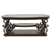 This elegant coffee table blends timeless design with practical functionality. The clear tempered glass top offers durability and a polished look, while the dark bronze powder-coated metal legs add a refined touch. A dark merlot wood finish highlights the engineered wood and cherry veneer construction. The middle shelf features a glossy wooden surface, offering additional display or storage space. Intricate scrollwork detailing enhances the classic appeal, making it a perfect centerpiece for any living room. Key Features: • Coffee table with a clear tempered glass top for a sleek and durable surface • Metal legs feature a dark bronze powder-coated finish for a refined appearance • Dark merlot wood finish highlights engineered wood and cherry veneer • Middle shelf with a polished wooden surface for display or storage needs • Ornate scrollwork accents provide a classic and timeless design • Sturdy construction with mixed materials of metal, wood, and veneer