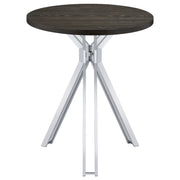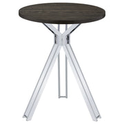 Gather around this sleek rustic-inspired contemporary bar table to wet your whistle. Designed with a wonderful contrast of woodsy and metallic elements, this beautiful modern bar table takes a masculine approach fit for game nights and beyond. Stand around with a drink in hand or coordinate with the bar stool of your choosing, talking over the charming, round, dark oak table top. Edgy polished chrome legs present an hourglass-like pedestal base for a dramatic, yet elegant touch. Set this inviting bar table in a casual entertainment room for a metallic accent and barrel-like element of surprise. Key Features: • A round table top is perfect for floating in a room • The dark oak finished paper veneer top maintains an organic touch of nature • The hourglass shaped pedestal base offers an edgy elegance • An angled metal base presents a bold, masculine touch • Perfect for standing around or pulling up your own bar stools