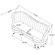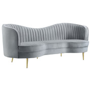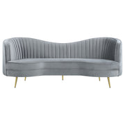 Art Deco never looked so dramatic! This retro-inspired seating set features a vivid deep blue velvet upholstery throughout, complementing by mid century modern style tapered legs in a warm gold hue. Extra details such as channel tufted interior and a vintage kidney-shaped silhouette truly make this seating ensemble one of a kind. A twist on the iconic tuxedo style, this seating group has sleek, slim track arms and an inverted camelback backrest that flows into one another. Boasting a regal aesthetic, each furniture piece offers to be a centerpiece. Key Features: • Sculptural modern glam in a beautiful shade of blue velvet • Both sofa and loveseat feature an inverted camel back creating the right touch of curve appeal • Tailored, vertical channels frame inside back providing a stylish back drop to the kidney shaped attached bench seat • Gold stainless steel tapered legs add the finishing touch