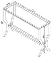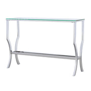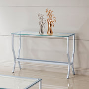 Add modern sophistication to your home with this sleek rectangular console table. Featuring a clear tempered glass top and a matching lower shelf, it offers ample space for storage or display. The elegant curved legs and open design enhance its airy, contemporary feel, while the electroplated polished chrome frame ensures durability and style. Perfect for hallways, entryways, or behind a sofa, this console table blends functionality with a striking modern aesthetic. Key Features: • Rectangular console table with a clear tempered glass top • Matching tempered glass shelf provides storage or display space • Curved, modern legs create an open and stylish aesthetic • Electroplated polished chrome base ensures strength and shine • Smooth tempered glass surfaces are easy to clean and maintain • Versatile design fits perfectly in hallways, entryways, or behind sofas