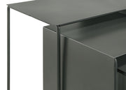 Simplicity of design shows itself to stellar effect in this three-piece industrial nesting table set. Offering versatility in your multi-functional living space, the three tables consolidate underneath the largest to minimize their footprint. Separate the tables as needed, or choose a waterfall configuration to add depth and dimension in your den or living room. Each table features iron construction with a sled-style base and dark gray finish that adds depth to surrounding decor. This compact design is the height of casual style and rugged functionality, perfect for contemporary living. Key Features: • Versatile three-piece industrial nesting table set • Consolidates underneath the largest table to minimize footprint • Iron construction with a sled-style base and dark gray finish • Compact design is the height of casual style and rugged functionality • Perfect for contemporary living spaces