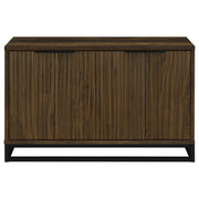 Clean lines and a bold finish beef up the aesthetics of an accent cabinet that will transform your dining room or living space in sleek style. The Ryatt accent cabinet delivers rustic beauty with a dark pine finish over wood products construction. A hint of industrial flavor adds an edgy look to this spacious cabinet featuring carved, fluted door fronts. Four doors open to provide access to storage on two fixed shelves. A black metal cross bar base is linear and compelling. Key Features: • Dark pine finish over wood products construction • Carved, fluted door fronts • Four doors open to provide access to storage • Spacious cabinet with two fixed shelves • Black metal cross bar base for linear appeal