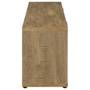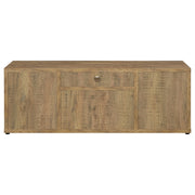 Center your entertainment set-up in this charming farmhouse TV stand. Featuring melamine paper in a mango finish, the console offers ample storage and plenty of charm. Layered coloring mimics the depth of true wood grain, while roughhewn saw marks add a sense of authenticity and dimensionality. Four cabinets open to reveal hidden storage, perfect for keeping media and gaming essentials tucked away. A center shelf is just right for a gaming console or media components, allowing for air circulation and line of sight for remote controls. Key Features: • Charming farmhouse TV stand with melamine paper in mango finish • Layered coloring mimics depth of true wood grain • Roughhewn saw marks add authenticity and dimensionality • Four cabinets open to reveal hidden storage • Center shelf perfect for gaming console or media components