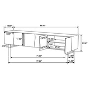 This spacious TV stand is crafted from solid mango wood, offering ample storage with its six doors and adjustable shelves. The mango brown finish highlights the natural beauty of the wood grain, giving it a warm and timeless look. Curved panel details on the doors add a modern touch, while interior shelves provide versatile organization options. Supported by sturdy metal legs, the sideboard blends rustic charm with industrial durability, complete with cable cutouts for media management. Key Features: • Solid mango wood 86-inch TV stand with spacious six-door design • Finished in a rich mango brown that enhances natural wood grain • Curved door panels add a modern and stylish visual accent • Adjustable shelves allow for flexible storage configurations • Sturdy metal legs ensure stability and long-lasting support • Cable management cutouts make it ideal for media organization