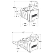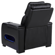 Perfectly sized for solo lounging, this dual power recliner blends tech-forward features with bold modern style. Enjoy power recline and an adjustable power headrest, plus side control panels with USB-A, USB-C, and a home button for seamless comfort. Blue LED under glow lights the base, while sleek cup holders are built into both arms. Upholstered in black leatherette with deep channel detailing, it’s a standout seat for any media room or lounge. Key Features: • Dual power recliner in black faux leather with power recline and power headrest function • Side panel includes USB-A, USB-C, and home button for personalized ergonomic control • Blue LED under glow lighting beneath base enhances lounge ambiance with bold flair • Sleek armrests include built-in cup holders for movie night or everyday relaxation • Upholstered in smooth leatherette with channeled back and seat for visual depth • Compact footprint suits home theaters, dens, or modern small-space living areas
