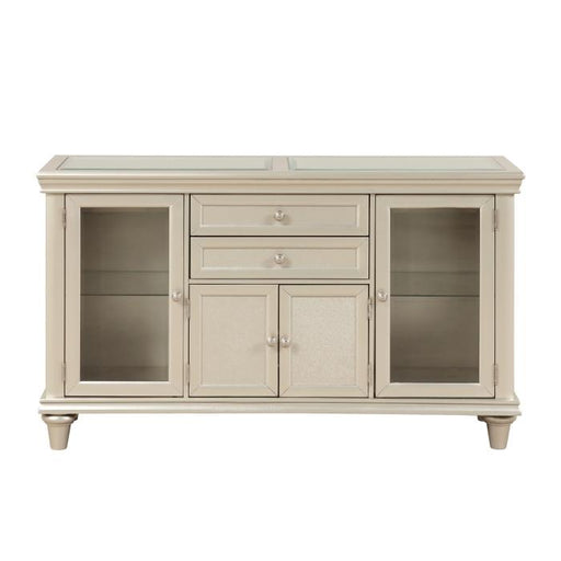 Celandine Collection by Homelegance Silver finish Made of embrossed MDF, glass and wood Dovetails ball bearing glides 2 Side cabinets with glass d...