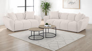 Contoured and contemporary, this greige chenille loveseat showcases sculptural volume and tailored construction. Splayed arms frame a wide, grid-tufted profile, while deep channeling emphasizes its bold silhouette. An attached waterfall seat features pocket coil support beneath plush foam, ensuring long-lasting comfort. Textured upholstery adds soft dimension, and two matching knife-edge pillows finish the look. A striking blend of form and function for modern lounging. Key Features: • Sculptural loveseat with splayed arms and bold form wrapped in soft greige chenille upholstery • Grid and channel tufting accentuates the plush, sculpted silhouette and padded contours • Attached waterfall seat features pocket coil construction for long-lasting support and comfort • Includes two matching knife-edge pillows for added texture and coordinated appeal • Textured chenille fabric offers soft hand-feel and subtle tonal variation • Built from rubberwood, plywood, and foam for structure and lasting everyday use